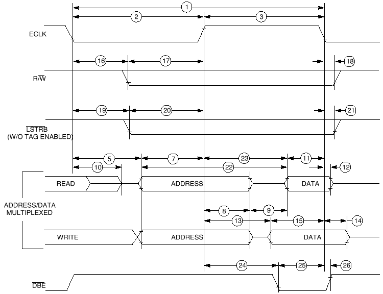 Das Signal /DBE (Data Bus Enable) zeigt an, daß ein externer Busteilnehmer nun seine Daten auf den Bus geben darf. /DBE wird aktiv spätestens 37 ns (24) nach der steigenden ECLK Flanke. Geht man davon aus, daß die H-Zeit von ECLK insgesamt 67 ns beträgt, so verbleiben noch 30 ns bis zur fallenden ECLK Flanke. Das ist genau der Wert, der im Datenblatt als Minimum für die "Data Read Setup Time" (11) gefordert wird. Der aufmerksame Leser wird nun stutzig, denn hier kann etwas nicht stimmen. Drei Deutungen bieten sich an: